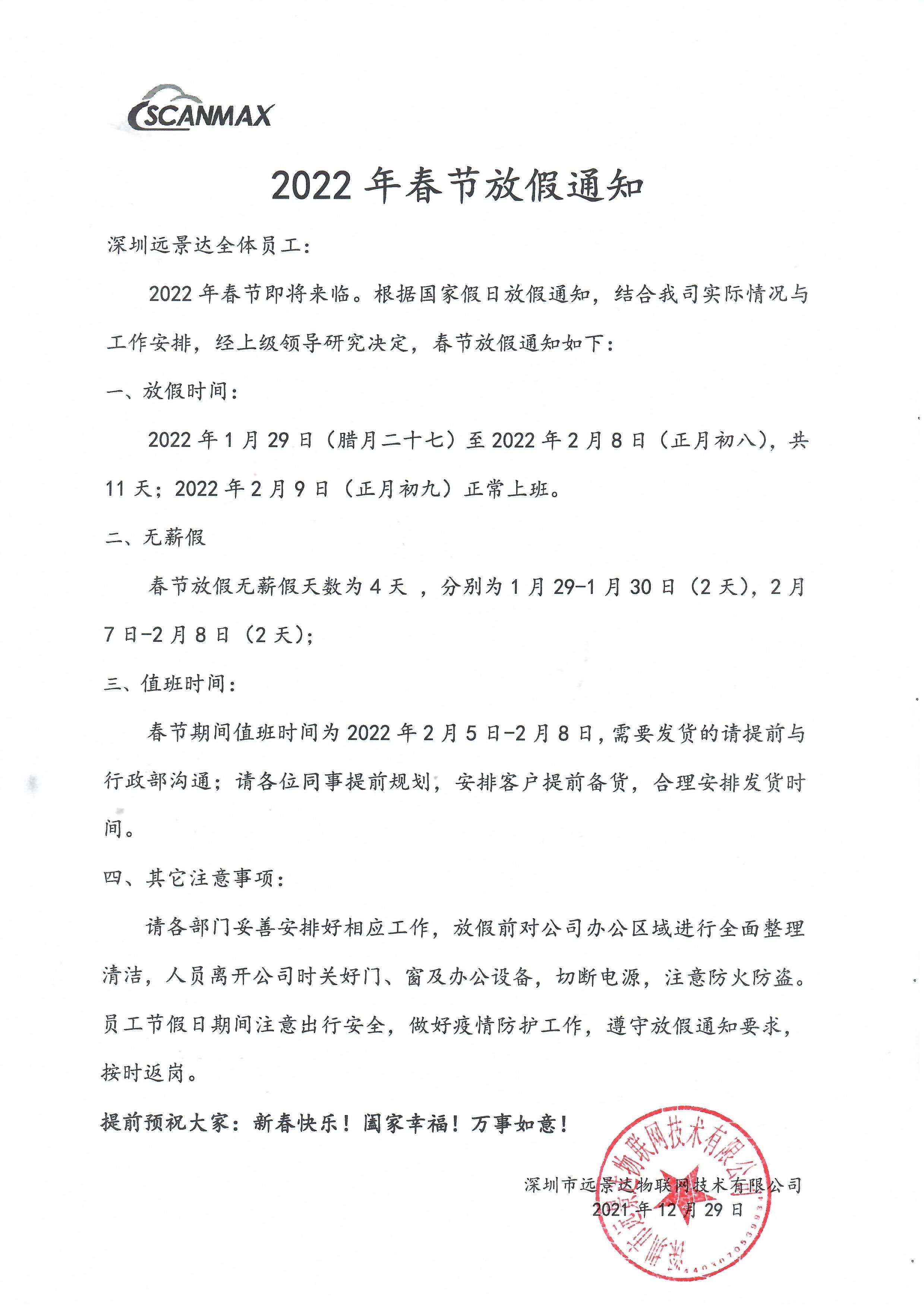 又是一年新春到,金虎迎新送福來。惜別2021,我們迎來了充滿希望、機遇與挑戰的2022!在此,我們非常感謝廣大新老客戶一直以來對遠景達公司的信任與支持。正值春節來臨之際,為了讓大家度過一個歡樂、祥和、平安的新春佳節,根據國家假日放假通知,結合我司實際情況與工作安排,經上級領導研究決定,春節放假通知如下: