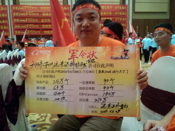 參與3T計劃的深圳遠景達負責人表示,在啟動儀式上,各“軍團”受“軍旗”、簽“軍令狀”,各參賽企業依次上臺報銷售目標、表決心。“為了突破外貿銷售瓶頸,此次我們公司將在3T計劃40天中沖刺210萬銷售額。”上述企業家說。