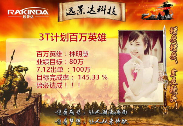 7月12日晚,錢進(jìn)隊(duì)林主管,成功斬獲遠(yuǎn)景達(dá)3T計(jì)劃期間的首個百萬訂單。在7月13日頒獎儀式上,劉總親自授予林主管“百萬英雄”錦旗,并當(dāng)場獎勵現(xiàn)金1萬元。