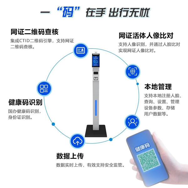 人臉識別健康碼掃碼測溫一體機是可以同時檢測體溫、查驗健康碼和身份證核驗等多功能的智能人臉識別體溫檢測健康碼門禁終端,人員通行時可使用身份證或電子健康碼在機器上進行掃描,人臉面部對準機器,即可自動測溫、身份核驗和健康碼自動識別驗證,綠碼人員即可順利通過。一“機”解決所有困擾,0接觸快速測溫,不僅節省了人力及時間成本,也降低了基層工作人員身份核查、測溫、查驗健康碼等的工作量,同時進一步降低交叉感染的風險。