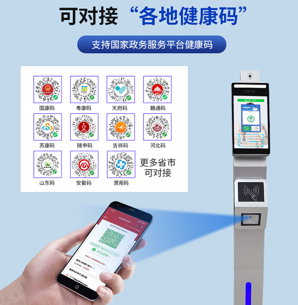 人臉測溫健康碼一體機,可以在刷臉的同時使用非接觸式體溫檢測方式準確無感測溫,配合健康碼掃碼器,能夠快速識別各地區健康碼及國家平臺健康碼,針對健康碼的時效性、真實性做核驗,避免使用無效碼、過期碼蒙混過關,同時也能降低基層防控人員接觸性感染的風險。