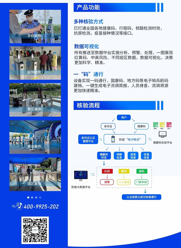 該“電子哨兵”自動掃碼系統能夠根據各地防疫政策或各場景防疫管控要求,組合使用掃健康碼、刷身份證及人臉識別等驗證方式在線核驗,快速識別人員健康碼狀態、核酸檢測情況、疫苗接種情況、體溫情況等信息,準確判斷該人員是否允許進入,并登記來訪人員的關鍵信息及對應時間,在后臺形成記錄。此外,健康碼自動掃碼系統在使用過程中,如果遇到過期健康碼截圖、紅黃碼、過期核酸檢測結果等異常情況,該產品會自動報警,提醒卡口工作人員處置,大大減輕了防疫人員的查驗工作量。