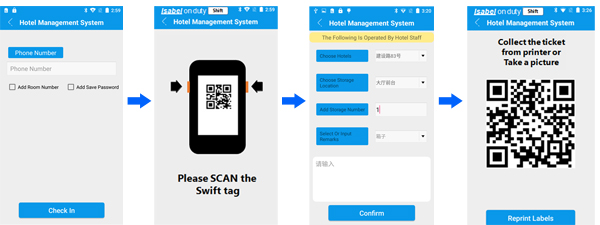 詳細說明:得到客戶行李->在手持機內輸入客戶信息【電話號碼,房間號,密碼】->客戶信息綁定吊牌->取吊牌(行李牌)并掃描吊牌上的二維碼,綁定成功后并輸入行李數量->將 QR 碼顯示給客戶拍照或可按“打印”獲取收據和行李貼紙、將貼紙貼在行李上->在其中一個綁上吊牌并存入倉庫