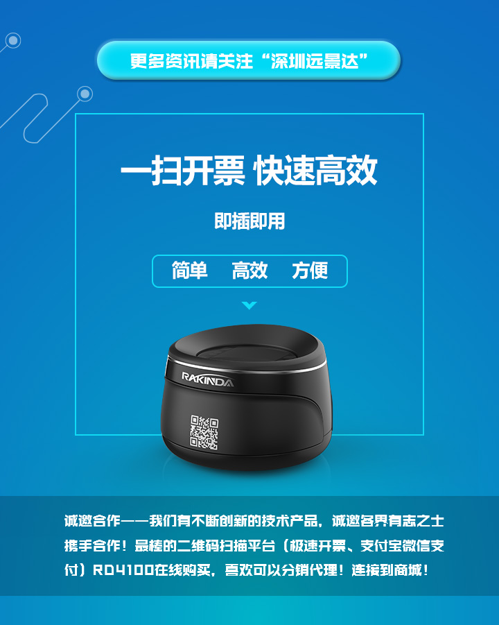 遠景達閃電開票設(shè)備是一款3秒閃電開票、0差錯的神器。操作簡單,用戶只需使用公眾號的“發(fā)票助手”生成開票二維碼,然后用遠景達閃電開票設(shè)備掃描二維碼,就能自動錄入到稅控軟件(例如:航天信息、百望金賦等)開票界面。大大提高企業(yè)開票效率,開票無需手工錄入,顧客無需再等!
