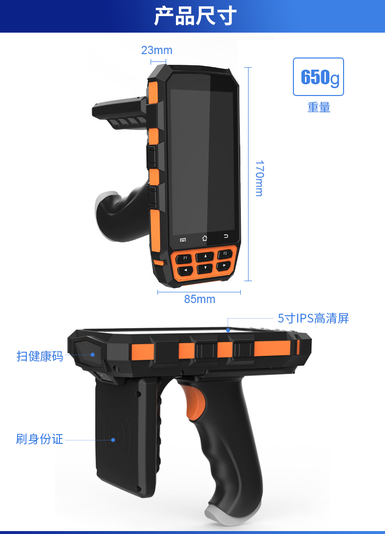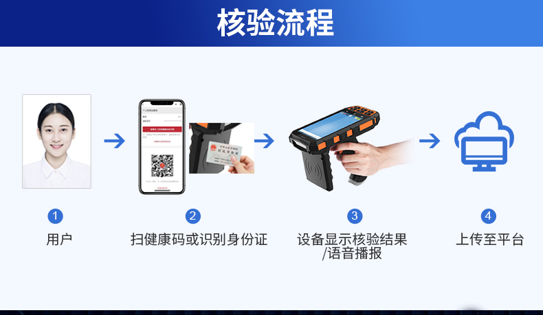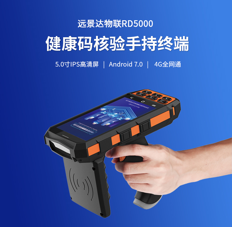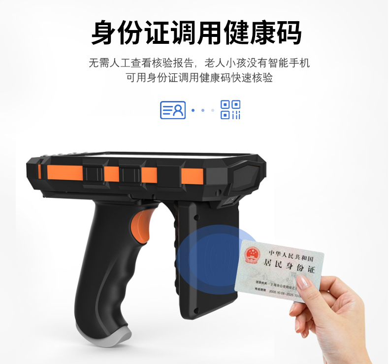 RD5000系列手持式健康碼核驗終端擁有卓越的高速二維碼掃描、身份證識別讀寫性能,支持身份證識別健康碼。RD5000健康碼檢測設備支持身份證調用健康碼快速核驗,設備顯示核驗結果并語音播報,數據實時上傳云平臺,準確率高,能高效篩查出異常情況。