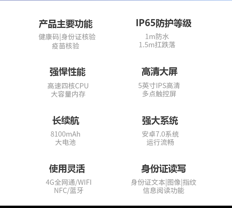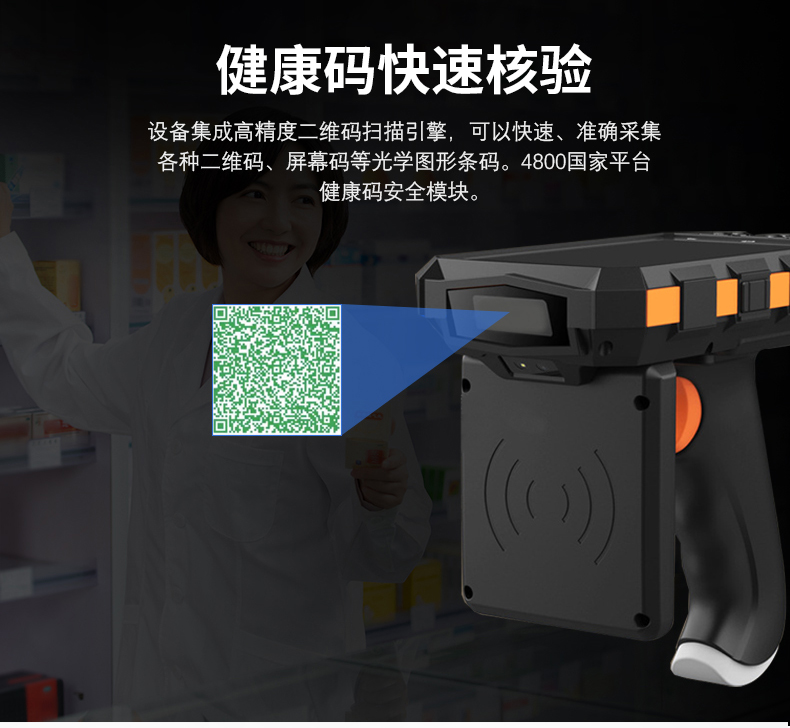 ? 高速二維碼掃描:設備集成高精度二維碼掃描引擎,可以快速、準確采集各種二維碼、屏幕碼等光學圖形條碼。嵌入RD4800安全模塊支持掃描核驗(國康碼)健康碼。