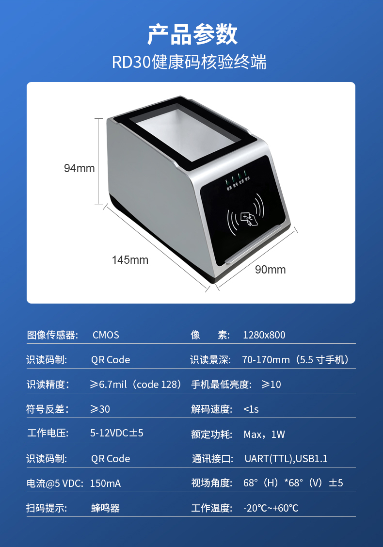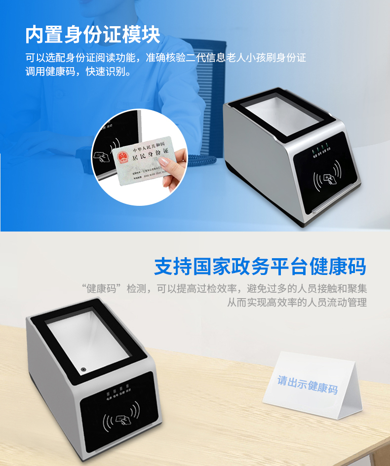 RD30-R支持掃碼驗證國家平臺健康碼,身份證驗證國家平臺健康碼,提供USB接口對接電腦插件使用。