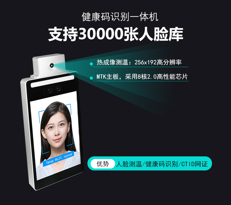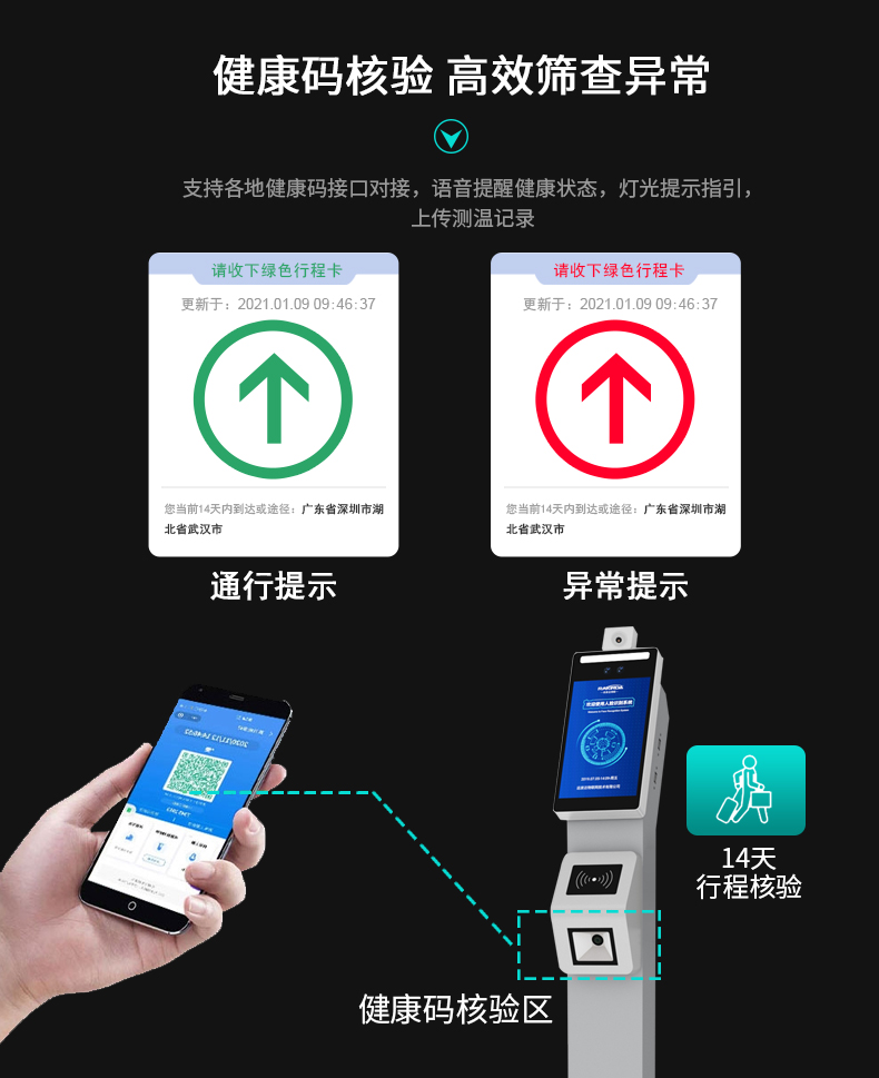 健康碼測(cè)溫門禁一體機(jī)系列支持口罩檢測(cè),人臉,身份證,健康碼,14天行程,核酸查詢等功能為一體的溫控健康碼驗(yàn)證閘機(jī)。身份證識(shí)別/刷碼獲取健康碼平臺(tái)數(shù)據(jù)與核酸記錄查詢,全國(guó)通用。健康碼測(cè)溫門禁一體機(jī)廠家全國(guó)直銷,適用全人群、多場(chǎng)景應(yīng)用需求,安裝簡(jiǎn)單,讓防控更高效!