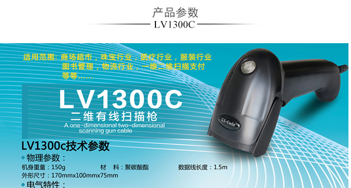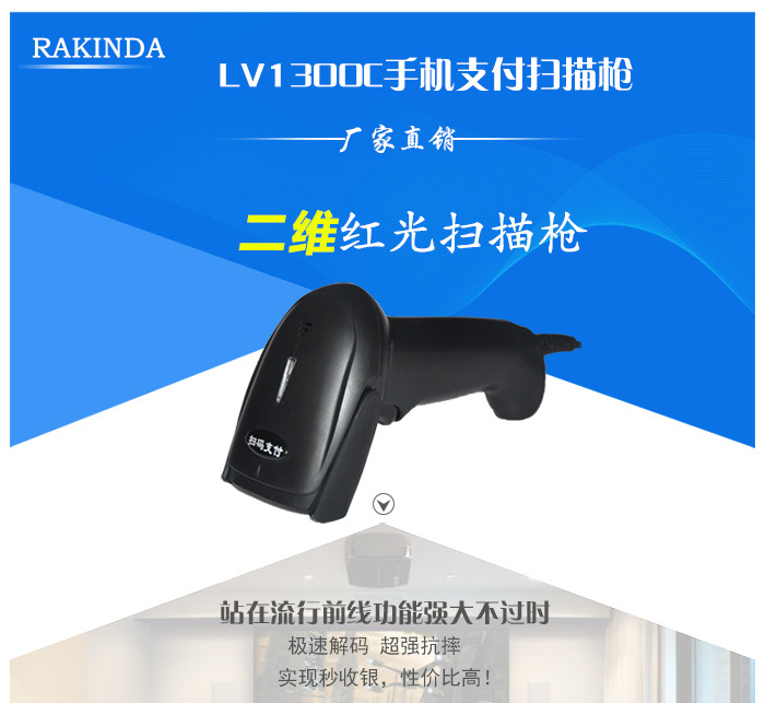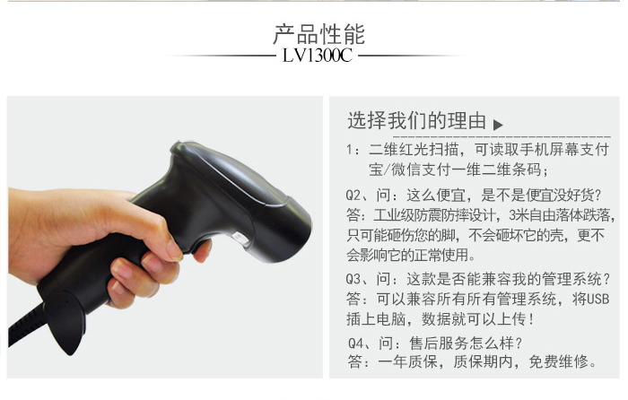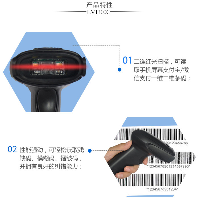 LV1300C二維紅光掃描,性能強勁,可讀取手機屏幕支付寶/微信支付一維二維條碼,并對殘缺碼、模糊碼、褶皺碼,并擁有良好的糾錯能力。