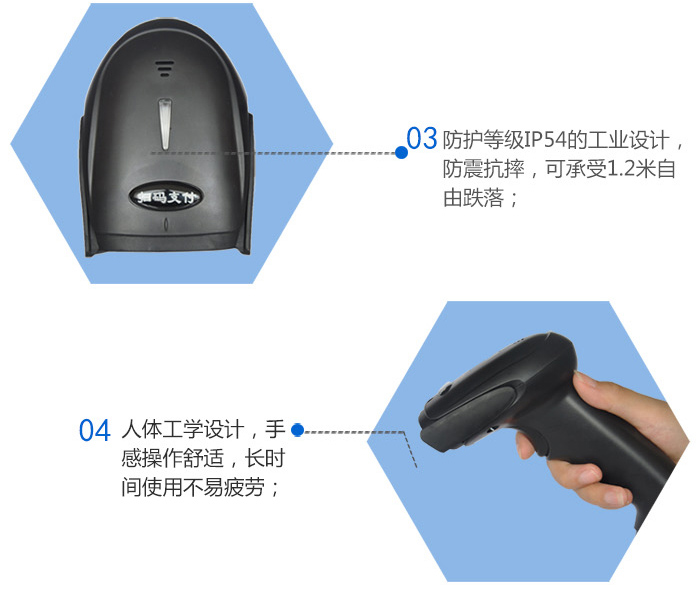 1、二維紅光掃描頭,可讀取手機屏幕支付寶/微信支付一維二維條碼;