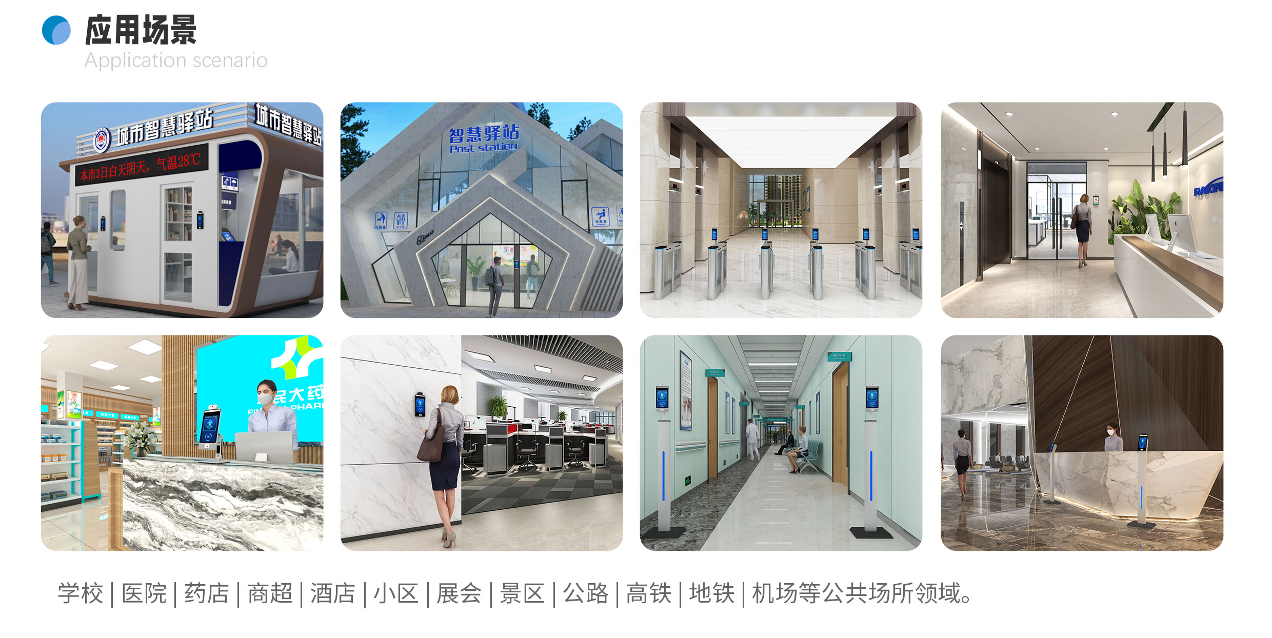 可搭配通道閘和門禁控制,適用于社區、寫字樓、企業辦公政府機關、高校學院、圖書館、博物館、旅游景區等公共場所領域。