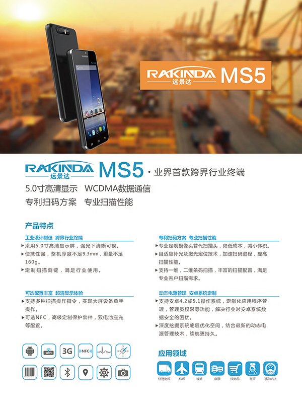 遠景達MS5作為全球首款跨界行業終端,完全顛覆了傳統行業終端形態,如同民用手機般輕薄。5.0吋高清屏、多點觸控電容屏;支持一維/二維條碼掃描、NFC等功能;微型定制攝像頭替代專業掃描頭,實現了掃描方式迭代更新;激光定位技術加快掃碼速度;自適應補光技術(白光加高穿透性紅光)提高掃碼準確率。這款革命性產品,充分利用手機自有功能,讓行業終端變小,讓產品價值變大,讓開發節奏變快。結合商業模式創新,能夠快速普及到各類行業市場。