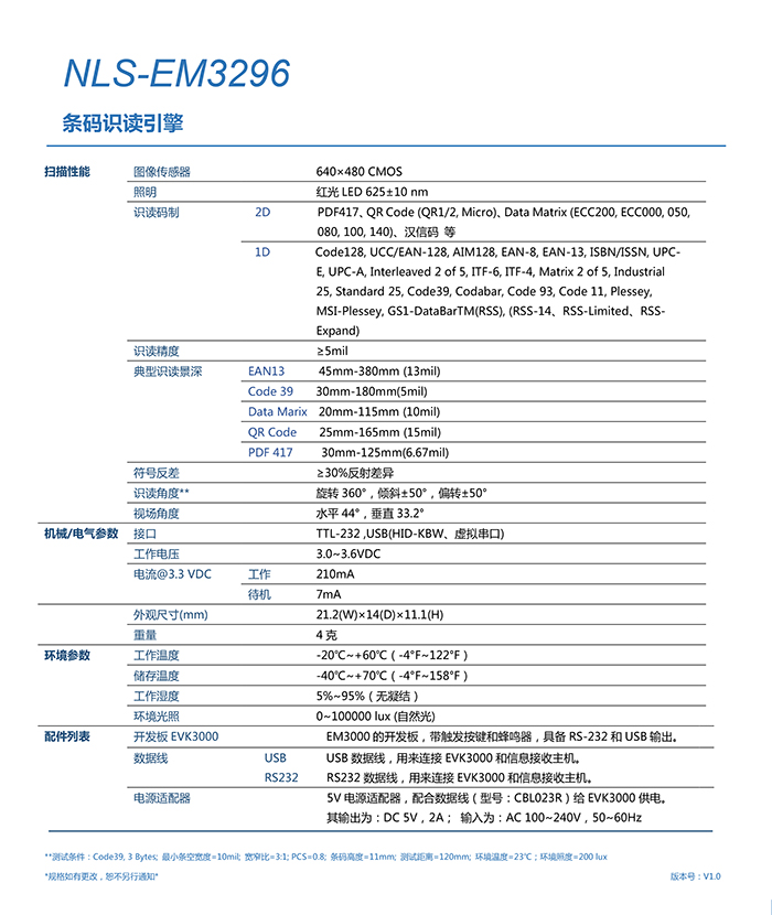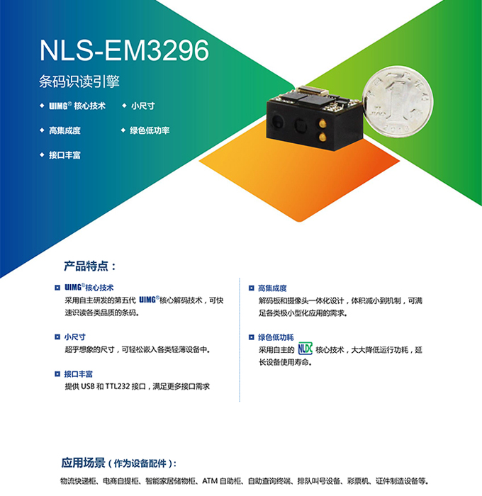 EM3296條碼識讀引擎,是EM3096的升級版。該系列的二維碼掃描模組采用卓越的解碼技術,能夠快速地識讀紙張/屏幕的一維、二維條碼。高集成度、低功耗、尺寸小巧,具有良好的性價比,非常適合嵌入在PDA設備、POS設備、平板設備及各類輕薄型設備中使用,可滿足各類極小型化工業手持終端條碼掃描的應用需求。