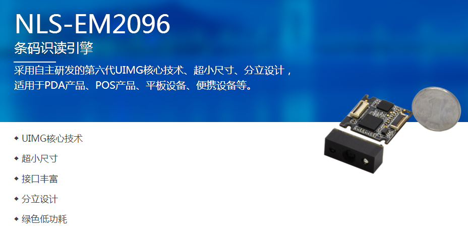 EM2096嵌入式條碼掃描模塊,采用卓越的智能核心解碼技術,并有效針對屏幕條碼識讀做了特殊校驗,可適應最低亮度以及各類貼膜的大數據量屏幕條碼。此外,EM2096系列二維碼掃描頭的圖像采集器與解碼板分立設計,安裝靈活,非常適用于對空間要求比較緊湊的終端應用,如PDA產品、金融POS終端、桌面掃描設備、自助查詢設備等。