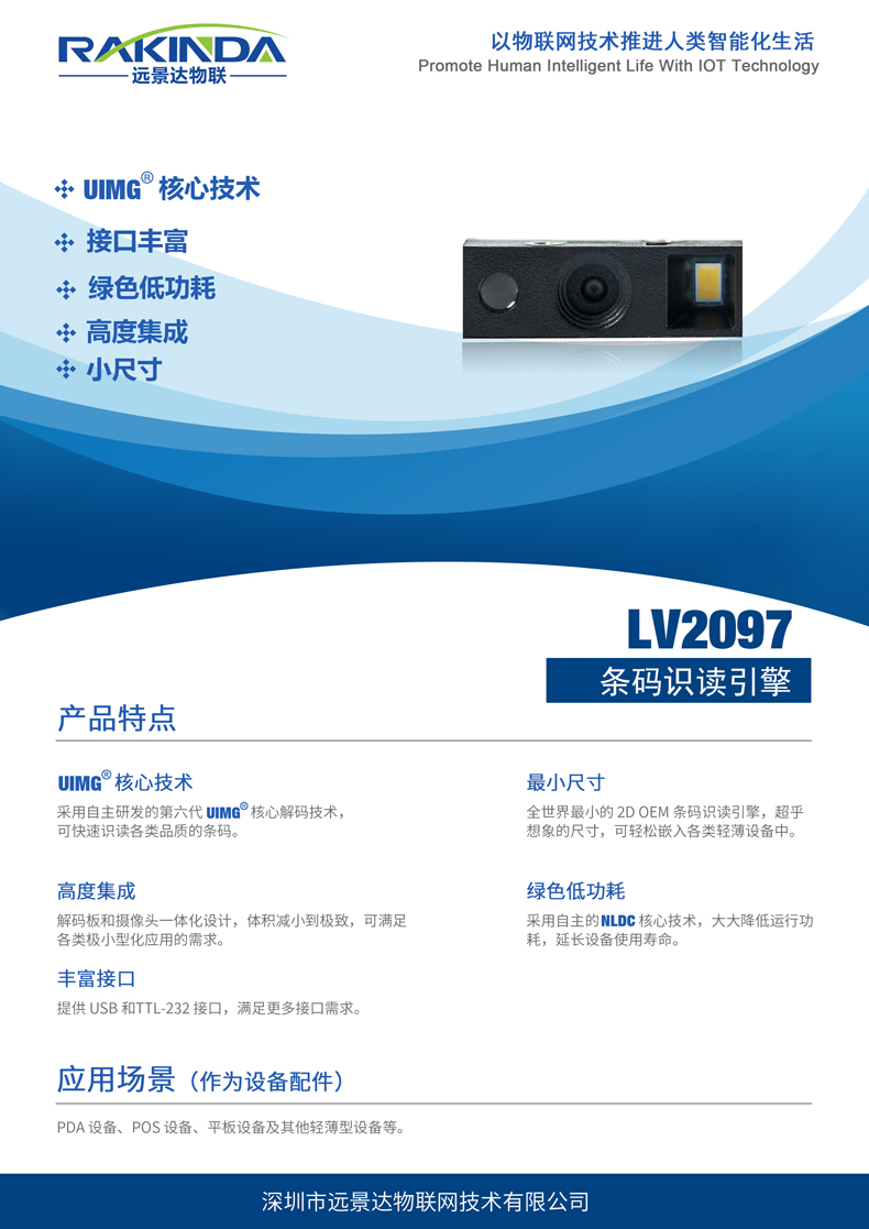 LV2097微型條碼掃描模塊采用自主研發(fā)的智能核心解碼技術(shù),能夠快速地識讀紙張/屏幕的一維/二維條碼。該系列的一維/二維條碼識讀引擎專為客戶提供的OEM產(chǎn)品應(yīng)用,高集成度、低功耗、尺寸小,可實現(xiàn)各種嵌入式應(yīng)用。