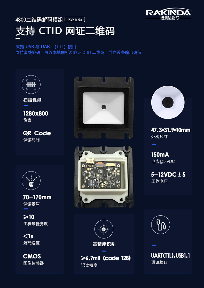 4800 模組是基于遠景達CTID 二維碼解碼模組開發的,針對網證CTID的各種應用場景設計的硬件級模組,可用于識別驗證國家防疫健康碼,具備網證CTID的解碼、驗碼等能力。