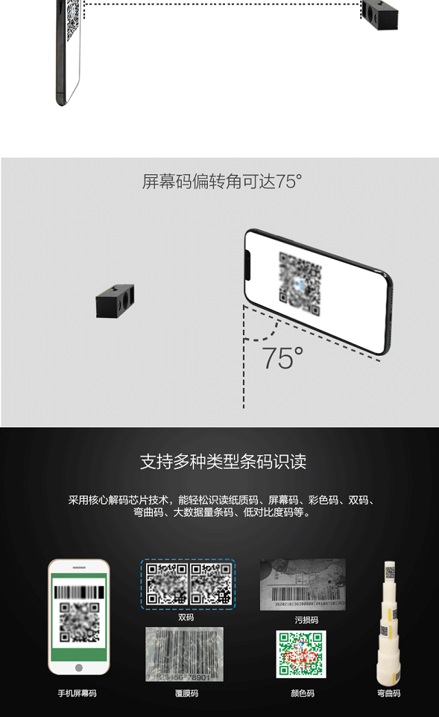針對屏幕條碼做特殊校驗,可適應低亮度及各類貼膜的大數據量屏幕條碼。