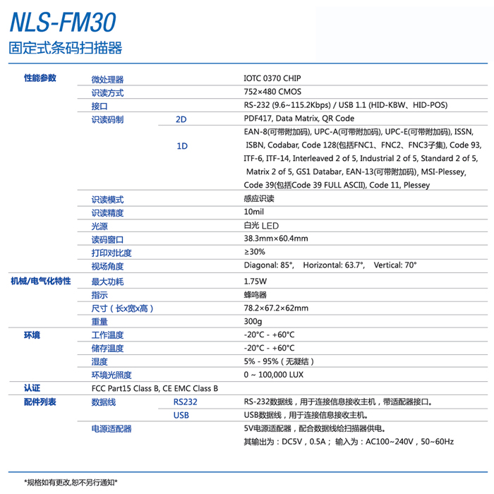 FM30是一款嵌入式一維/二維掃描模塊。該系列的條碼掃描模組采用了卓越的CMOS影像技術以及國際領先的智能圖像識別系統。該產品識讀性能強大,可以快速讀取手機屏幕和紙質文檔上的條碼信息;支持二次開發,支持支付寶、微信支付一維、二維付款條碼的讀取,即使在手機電量不足、手機屏幕貼膜、彩色條碼等情況下也能輕松讀取條碼。主要應用于電子憑證、移動營銷、辦公自動化等領域。