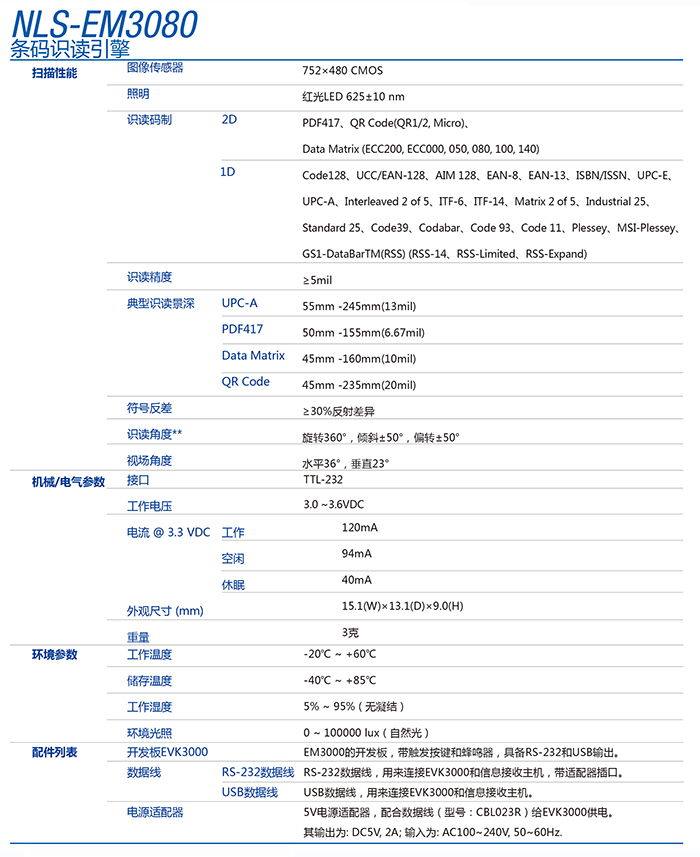 EM3080可識讀各類主流一維條碼、PDF417、QR Code(QR1、QR2、Micro QR)和Data Matrix的各種版本,還支持識讀GS1-DataBarTM(RSS)條碼,包括RSS-Limited、RSS-14、RSS-14 Stacked、RSS-Expand等版本。