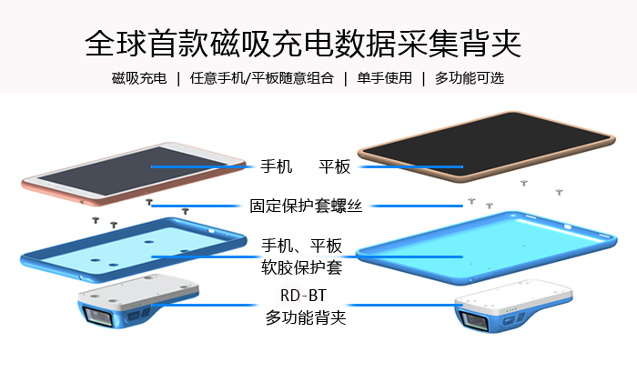 RD-BT,全球首款磁吸充電數(shù)據采集背夾,讓手機/平板“秒”變專業(yè)信息化終端,推動政企行業(yè)移動信息化大普及。適用場景:移動護理、快遞物流、倉儲、門店、二維碼支付、生產管理、電力抄表等。
