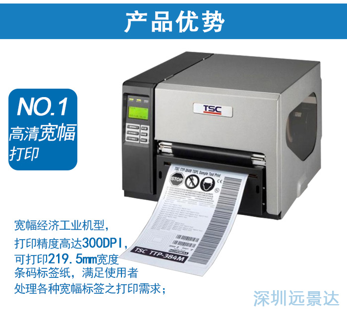 TSC TTP-384M條碼打印機,針對需求大尺寸、高打印質(zhì)量卷標所全新開發(fā)的多功能工業(yè)等級條形碼打印機,機身結(jié)構(gòu)系以鋁合金鑄造而成,堅固、精確且穩(wěn)定度高,充分滿足使用者處理各種寬幅標簽之打印需求。TSC TTP-384M以工業(yè)型高標準產(chǎn)品規(guī)格、高質(zhì)量打印表現(xiàn)、多功能基本配備、人性化操作接口,提供客戶同等級寬幅標簽打印設備中最經(jīng)濟的選擇,應用范圍包含警語標示、運輸物流、倉儲管理、規(guī)范性標簽以及其它多種材質(zhì)打印,并可同時打印多排小標簽,不需分次處理,大幅提升工作效率、降低營運成本。
