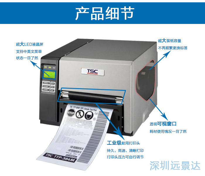 TSC TTP-384M主要特色:鋁合金鑄造機身搭配金屬外殼與透明窗口碳帶容量600公尺標簽耗材最大外徑8.2英吋;大型液晶顯示屏(含背光顯示) 配備6個操作按鈕標準配備包含串行端口、并列端口、內(nèi)部以太網(wǎng)絡打印服務器、USB 2.0和PS/2鍵盤連接接口;內(nèi)建內(nèi)存32 MB SDRAM、8 MB Flash和一個SD卡內(nèi)存擴展槽;人性化的高階打印機語言最佳的軟件兼容環(huán)境,內(nèi)建可以重設大小的向量字體,可仿真其他品牌條形碼。