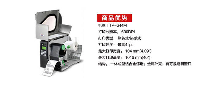 TSC TTP-644M(600DPI)工業級高清條碼打印機,打印速度高達每秒12英吋,系同等級機種中最高速的條形碼打印機。標準配備包含內部以太網絡打印服務器、USB2.0和PS/2鍵盤 連接接口;內建內存規格為32 MB DRAM、8 MB FLASH和一個SD卡的內存擴充槽,使用者得以最經濟的成本將內存容量擴充至4 GB。碳帶容量最大長度可達600公尺;標簽耗材最大外徑208公分(8.2英吋)。一體成型的鋁合金鑄造機臺,不論處理急迫性的大量打印或是單一批量打 印,TTP-644M 都能以絕佳的質量、效率及穩定度來完成您每一次的打印任務。